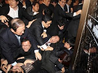 Harian JoongAng Ilbo, menulis baku hantam para anggota parlemen itu berlangsung dalam sidang Rabu, 8 Desember 2010.